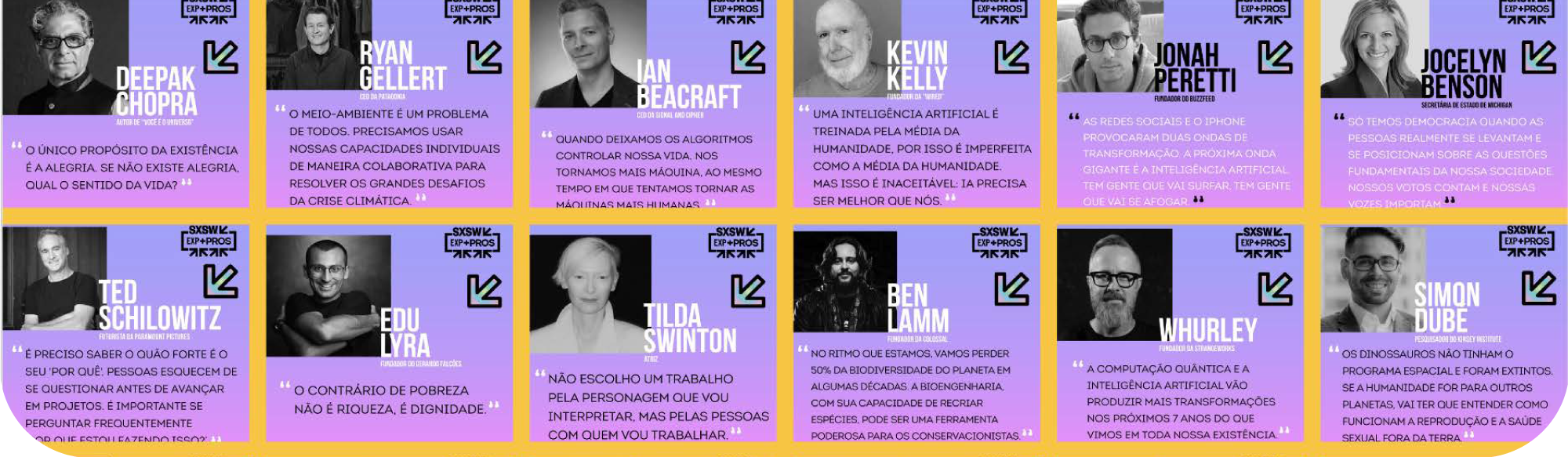Cobertura em real time: frases, insights, resumos, áudios e vídeos trazendo o melhor do SXSW – inclusive um roteiro com curadoria das palestras mais importantes de cada dia de festival.